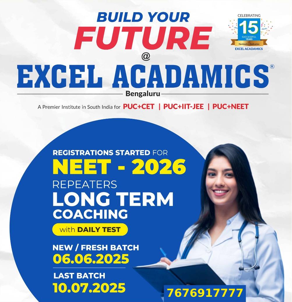 EXCEL ACADAMICS is the ultimate destination for NEET/CET/JEE LONG TERM/REPEATERS Coaching for Achieving Medical/Engineering Seats. It's the place where your dreams of becoming a successful medical professional can take root and flourish. What makes EXCEL ACADAMICS stand out is our Dedicated Team of Educators who are experts in their fields. We have a unique talent for simplifying complex topics, making them easy to understand. You won't have to struggle to grasp difficult concepts because they break them down into bite-sized pieces. One of the key strengths of EXCEL ACADAMICS is its comprehensive Study Materials. These materials are carefully designed to cover every single topic you need to know for the NEET Exam. We leave no stone unturned, ensuring that you are well-prepared for every aspect of the test. But EXCEL ACADAMICS goes beyond just giving you study materials. We understand that practice makes perfect, and we provide ample opportunities for you to practice. We conduct Daily mock tests and practice sessions that mimic the actual NEET exam. This not only helps you get used to the exam format but also builds your confidence and time management skills. What truly sets EXCEL ACADAMICS apart is the individualized approach. We don't believe in a one-size-fits-all method of teaching. Instead, we pay attention to your progress and provide personalized guidance. The teachers here take the time to understand how you're doing and where you need help. This means we can give you special guidance that suits your needs by conducting daily Study Hours. We identify your strengths and areas where you need improvement and adjust their teaching methods accordingly. We ensure that you get the support you need to excel in the NEET Exam. The Results speak for themselves. EXCEL ACADAMICS has a remarkable track record of producing NEET Toppers. Our students consistently achieve top scores, proving that our teaching methods are effective. So, if you're serious about succeeding in the NEET exam and fulfilling your dreams of becoming a doctor, EXCEL ACADAMICS is the place to be. We prioritize clarity, understanding, and achievement, making them the perfect choice for your NEET LONG TERM preparation. At EXCEL ACADAMICS, you're not just a student; you're a future medical professional, supported to succeed in both your studies and your personal growth, and are you all set to make a positive impact in the field of medical, Step into the world of excellence with EXCEL ACADAMICS – your journey to success begins here! EXCEL ACADAMICS has started Long Term Course to strengthen the students basics from fundamental to all concepts and make them able to practice hard in their weak areas in subjects well to get good marks in the Exam and get a good rank.